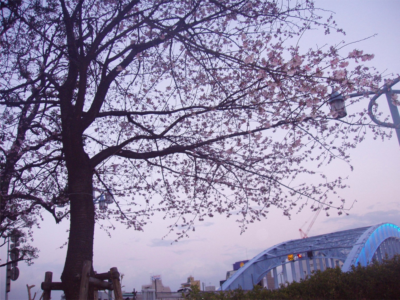 今週月からOL復帰。 良いお天気がつづいています。 この日、木曜日昼休みに外へ出ると、ごらんのように桜が満開! ?今 何月? 時間がなくなったので、5:30まで残業の後、帰りにゆっくりとシャッターを切りました。
